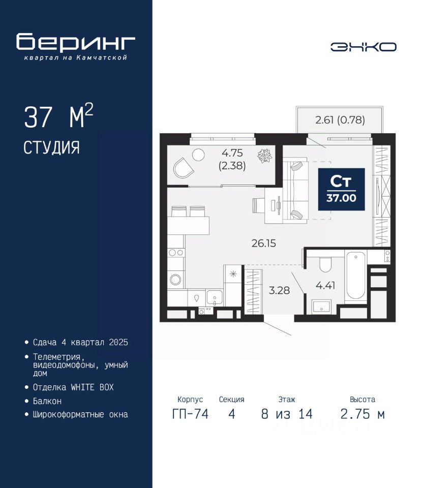 Просторная 1-комн. квартира-студия в ЖК "Беринг" на 8 этаже. Квартира без отделки, полностью готова к чистовой отделке и дальнейшему ремонту. Общая площадь: 37 кв.м., площадь гостиной 26.15 кв.м., из которых 5 кв.м. выделено под кухонную зону. Все окна выходят на одну сторону. В квартире один балкон, один совмещенный санузел. Высота потолков 2.75 м.