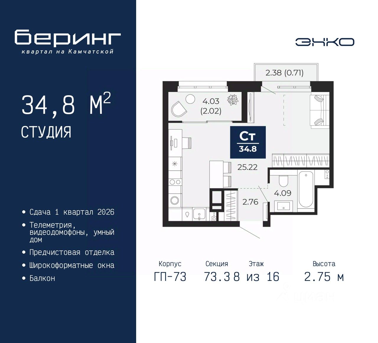Продается 1-комн. квартира-студия с предчистовой отделкой в ЖК "Беринг" на 8 этаже. Общая площадь: 34.8 кв.м., площадь гостиной 25.22 кв.м., из которых 5 кв.м. выделено под кухонную зону. Все окна выходят на одну сторону. В квартире один балкон, один совмещенный санузел. Высота потолков 2.75 м.