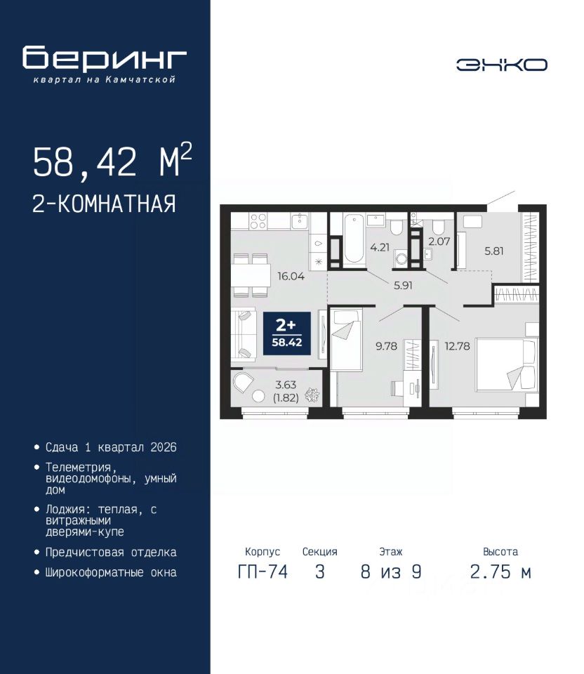 Двухкомнатная квартира с предчистовой отделкой в ЖК "Беринг" на 8 этаже. Общая площадь: 58.42 кв.м., жилая: 22.56 кв.м., площадь просторной кухни-столовой: 16.04 кв.м. Комнаты изолированные, все окна выходят на одну сторону. В квартире одна лоджия, один совмещенный и один раздельный санузел. Высота потолков 2.75 м.