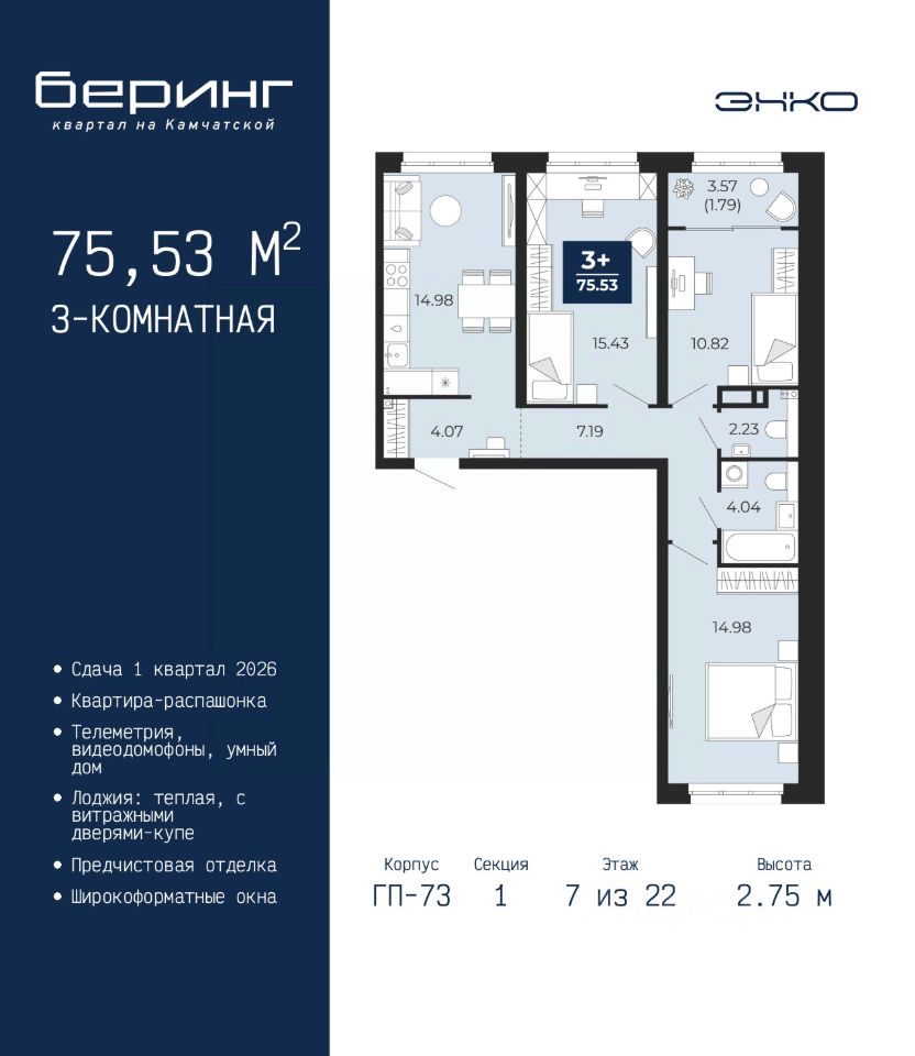 Продается 3-комн. квартира с предчистовой отделкой в ЖК "Беринг" на 7 этаже. Общая площадь: 75.53 кв.м., жилая: 41.23 кв.м., площадь просторной кухни-столовой: 14.98 кв.м. Квартира - распашонка, без проходных комнат, окна выходят на paзные стороны дома. В квартире одна лоджия, один совмещенный и один раздельный санузел. Высота потолков 2.75 м.