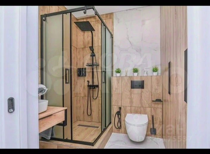 В санузле установлена стильная душевая кабина, кран скрытого монтажа, инсталляция iddis. На полу и стенах керамогранит. Встроенный шкаф с продуманными местами хранения.