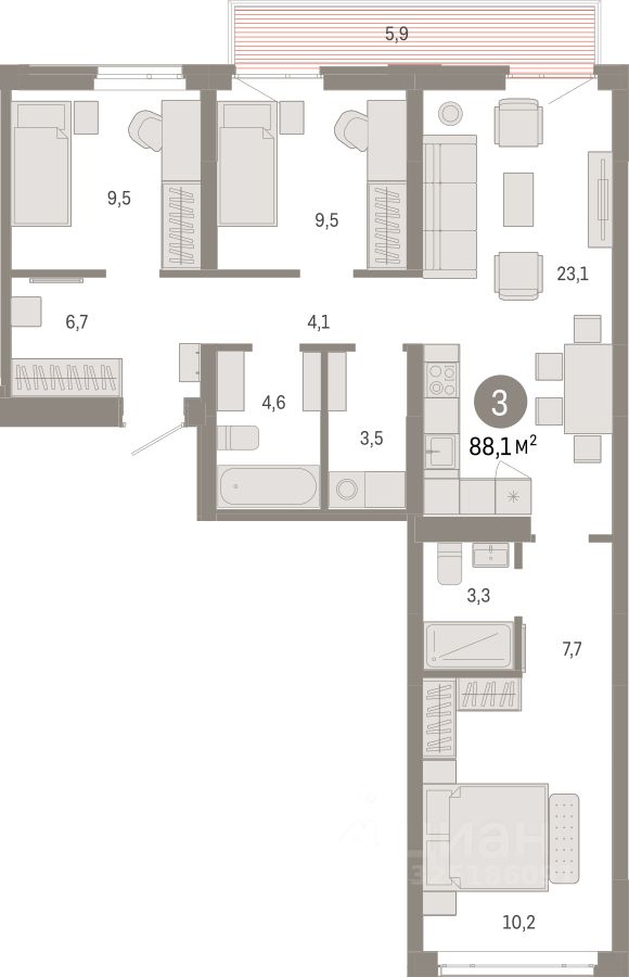 Трехкомнатная квартира с предчистовой отделкой в ЖК "Республики 205" на 3 этаже. Общая площадь: 88.09 кв.м., жилая: 29.2 кв.м., площадь просторной кухни-гостиной: 23.1 кв.м. Квартира - распашонка, без проходных комнат, окна выходят на paзные стороны дома. В квартире один балкон, два совмещенных санузла. Высота потолков 2.7 м.