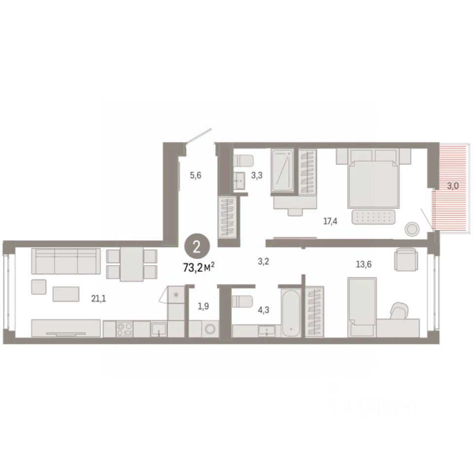 Продается 2-комн. квартира с предчистовой отделкой в ЖК "Республики 205" на 3 этаже. Общая площадь: 73.23 кв.м. Высота потолков 2.7 м.