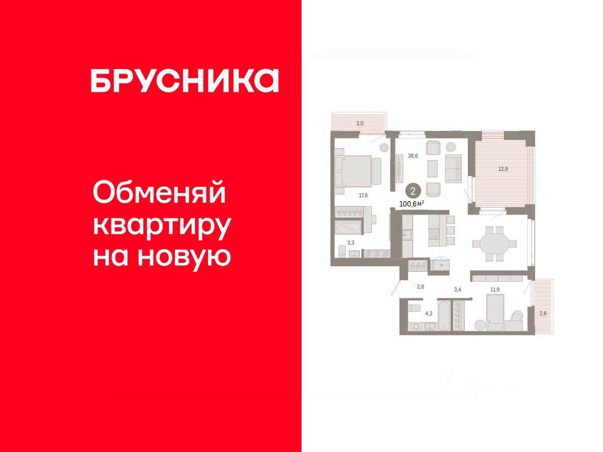 Двухкомнатная квартира от застройщика с предчистовой отделкой в ЖК "Республики 205" на 5 этаже. Общая площадь: 100.64 кв.м. Высота потолков 2.7 м.