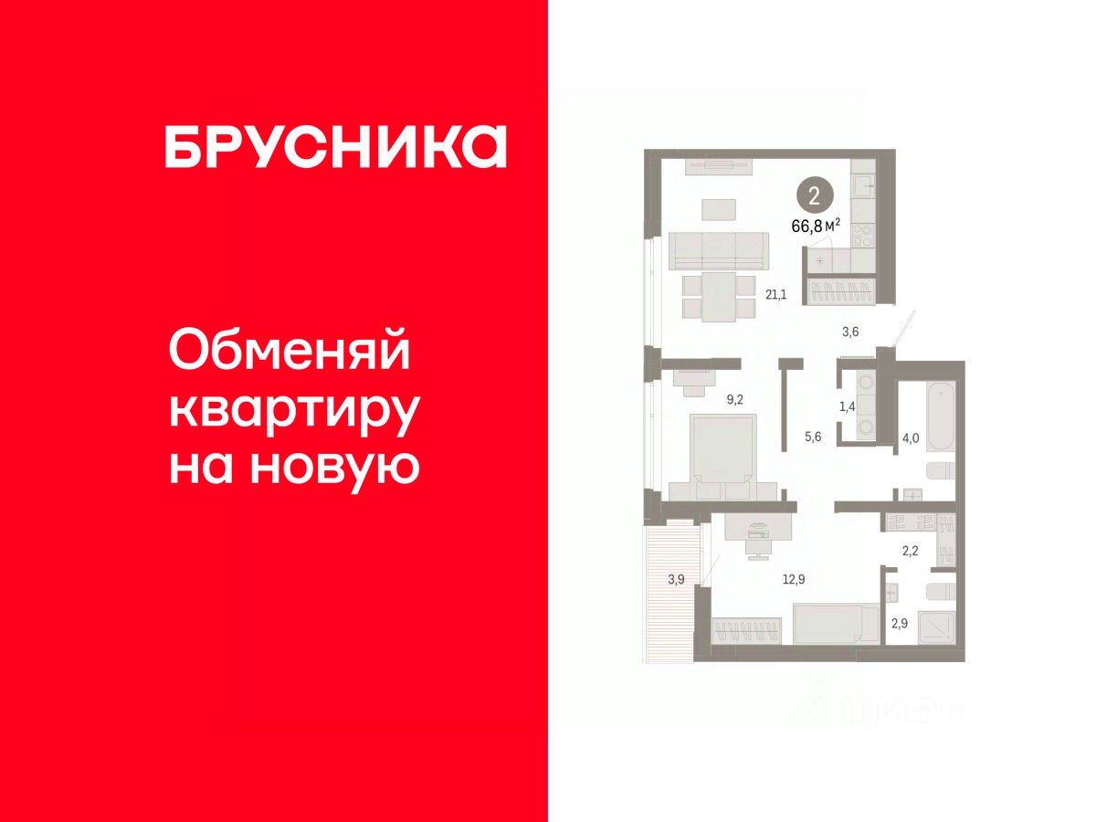 Просторная двухкомнатная квартира с предчистовой отделкой в ЖК "Республики 205" на 9 этаже. Общая площадь: 66.87 кв.м. Высота потолков 2.7 м.