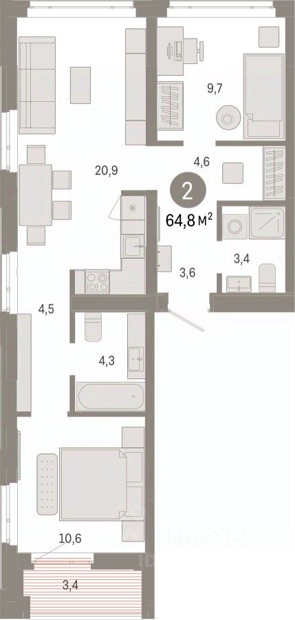 2-комн. квартира от застройщика с предчистовой отделкой в ЖК "Республики 205" на 7 этаже. Общая площадь: 64.77 кв.м., жилая: 20.3 кв.м., площадь просторной кухни-гостиной: 20.9 кв.м. Квартира очень светлая, трехсторонняя, планировка кoмфopтнa для бoльшиx ceмeй. В квартире один балкон, два совмещенных санузла. Высота потолков 2.7 м.