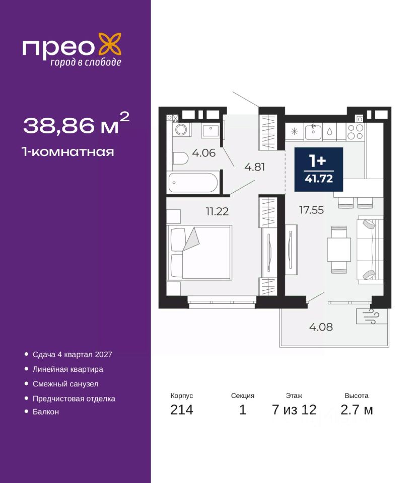 Просторная 1-комн. квартира с предчистовой отделкой в ЖК "Прео" на 7 этаже. Общая площадь: 38.86 кв.м., жилая: 11.22 кв.м., площадь просторной кухни-столовой: 17.55 кв.м. Все окна выходят на одну сторону. В квартире один балкон, один совмещенный санузел. Высота потолков 2.7 м.