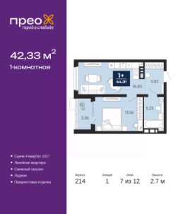 Продается 1-комн. квартира от застройщика с предчистовой отделкой в ЖК "Прео" на 7 этаже. Общая площадь: 42.33 кв.м., жилая: 13.55 кв.м., площадь просторной кухни-столовой: 16.85 кв.м. Все окна выходят на одну сторону. В квартире одна лоджия, один совмещенный санузел. Высота потолков 2.7 м.