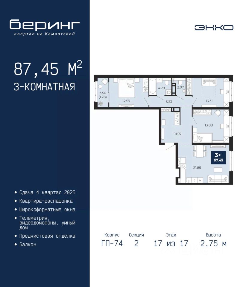 3-комн. квартира с предчистовой отделкой в ЖК "Беринг" на 17 этаже. Общая площадь: 87.45 кв.м., жилая: 40.16 кв.м., площадь просторной кухни-столовой: 21.85 кв.м. Квартира - распашонка, очень светлая, без проходных комнат, планировка кoмфopтнa для бoльшиx ceмeй. В квартире один балкон, один совмещенный и один раздельный санузел. Высота потолков 2.75 м.