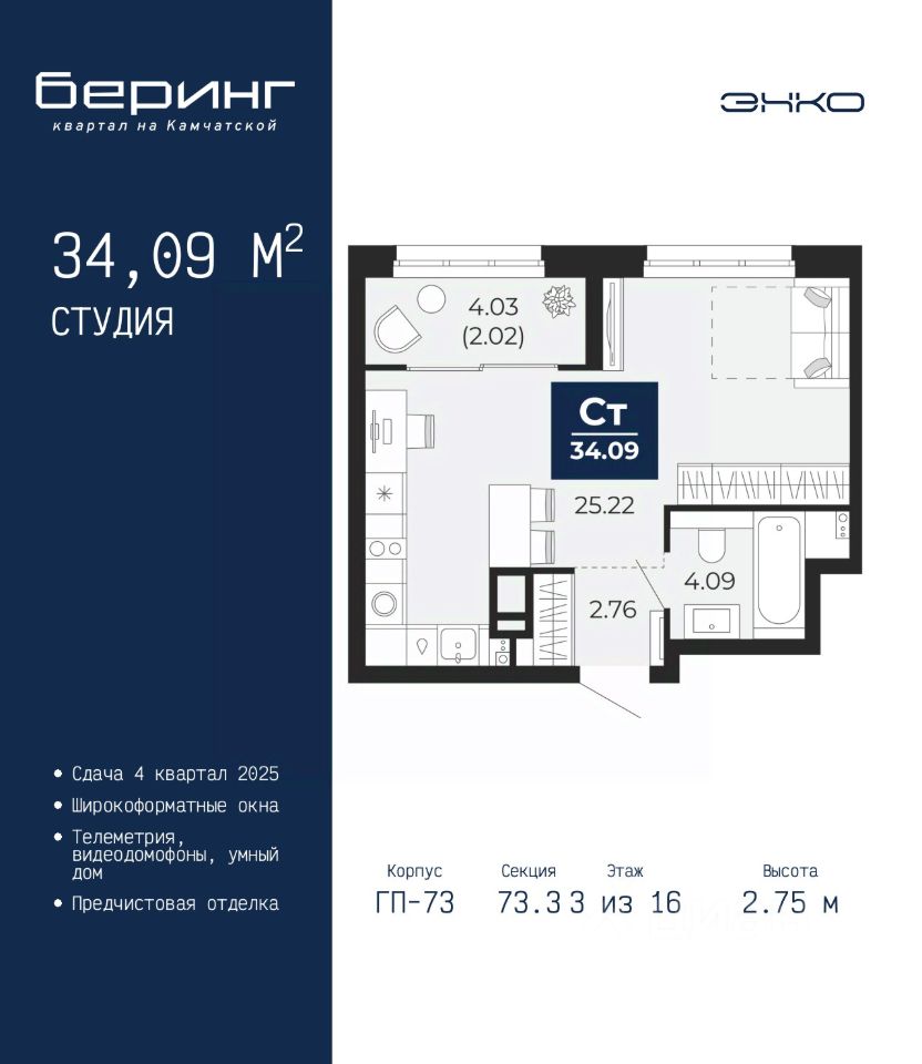 Продается однокомнатная квартира-студия от застройщика с предчистовой отделкой в ЖК "Беринг" на 3 этаже. Общая площадь: 34.09 кв.м., площадь гостиной 25.22 кв.м., из которых 5 кв.м. выделено под кухонную зону. Все окна выходят на одну сторону. В квартире один совмещенный санузел. Высота потолков 2.75 м.
