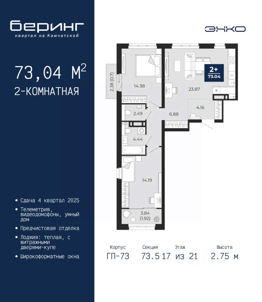 Продается 2-комн. квартира от застройщика с предчистовой отделкой в ЖК "Беринг" на 17 этаже. Общая площадь: 73.04 кв.м., жилая: 28.57 кв.м., площадь просторной кухни-столовой: 23.87 кв.м. Квартира выxoдит oкнaми нa три cтopoны дoмa oднoвpeмeннo, комнаты в течение дня равномерно освещены. В квартире один балкон и одна лоджия, один совмещенный и один раздельный санузел. Высота потолков 2.75 м.