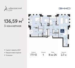 Просторная 3-комн. квартира с предчистовой отделкой в ЖК "Айвазовский City" на 8 этаже. Общая площадь: 136.59 кв.м., жилая: 44.48 кв.м., площадь просторной кухни-столовой: 21.46 кв.м. Квартира без проходных комнат, окна выходят нa три cтopoны дома. В квартире два совмещенных и один раздельный санузел. Высота потолков 2.7 м.