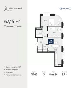Продается 2-комн. квартира с предчистовой отделкой в ЖК "Айвазовский City" на 8 этаже. Общая площадь: 67.15 кв.м., жилая: 29.01 кв.м., площадь просторной кухни-столовой: 21.8 кв.м. Квартира угловая, идеально подойдет любителям тишины и панорамных видов. В квартире один совмещенный и один раздельный санузел. Высота потолков 2.7 м.