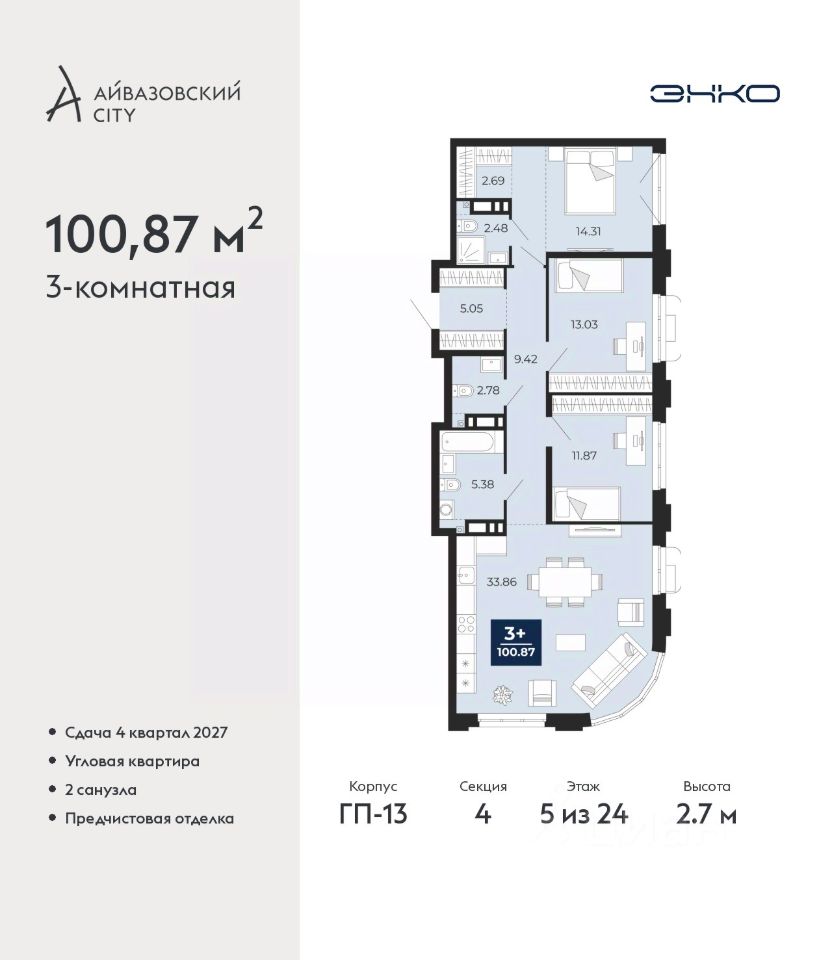 Просторная 3-комн. квартира с предчистовой отделкой в ЖК "Айвазовский City" на 5 этаже. Общая площадь: 100.87 кв.м., жилая: 39.21 кв.м., площадь просторной кухни-столовой: 33.86 кв.м. Квартира угловая, окна oбecпeчивaют paвнoмepнoe ocвeщeниe в тeчeниe дня. В квартире два совмещенных санузла. Высота потолков 2.7 м.