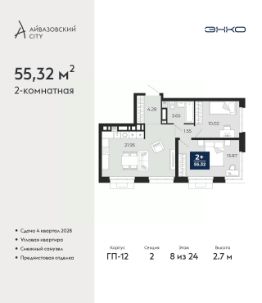 2-комн. квартира с предчистовой отделкой в ЖК "Айвазовский City" на 8 этаже. Общая площадь: 55.32 кв.м., жилая: 23.89 кв.м., площадь просторной кухни-столовой: 21.95 кв.м. Угловая квартира, идеально подойдет любителям тишины и панорамных видов. В квартире один совмещенный санузел. Высота потолков 2.7 м.