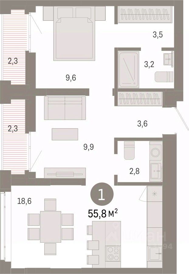 Однокомнатная квартира с предчистовой отделкой в ЖК "Республики 205" на 13 этаже. Общая площадь: 55.76 кв.м. Высота потолков 2.7 м.