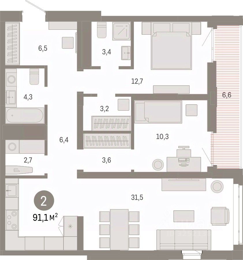 Продается двухкомнатная квартира с предчистовой отделкой в ЖК "Республики 205" на 8 этаже. Общая площадь: 91.08 кв.м. Высота потолков 2.7 м.
