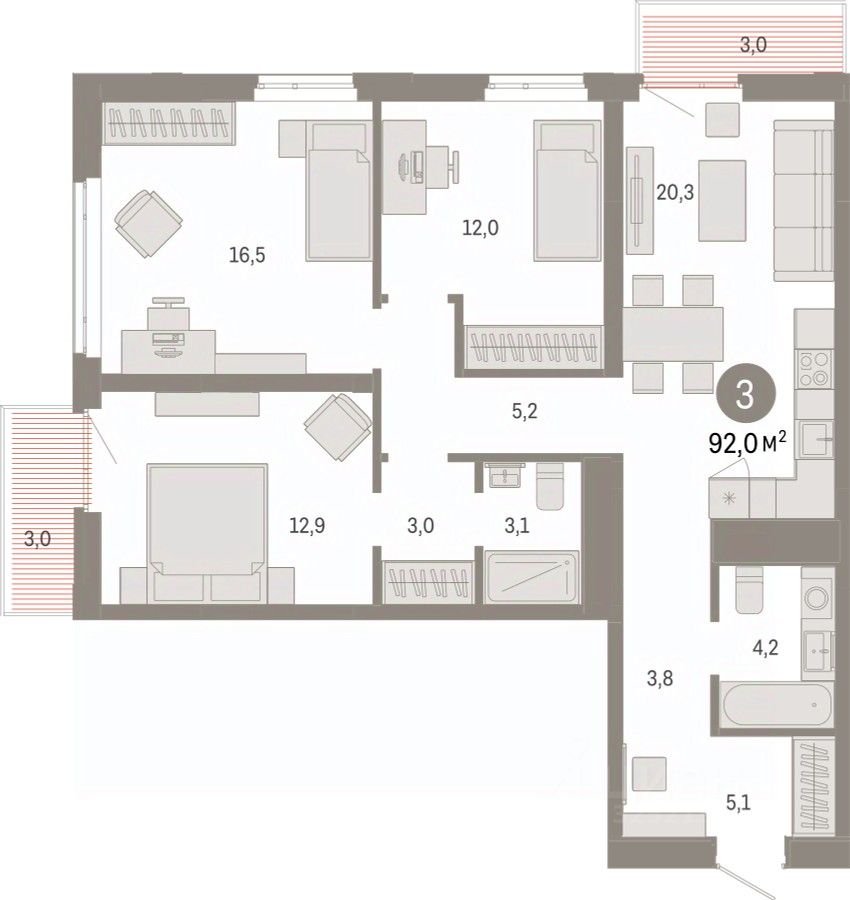 3-комн. квартира с предчистовой отделкой в ЖК "Республики 205" на 6 этаже. Общая площадь: 91.98 кв.м. Высота потолков 2.7 м.