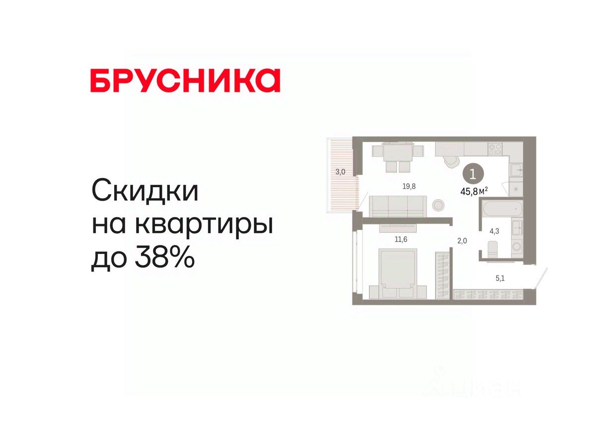 1-комн. квартира с предчистовой отделкой в ЖК "Республики 205" на 5 этаже. Общая площадь: 45.82 кв.м. Высота потолков 2.7 м.