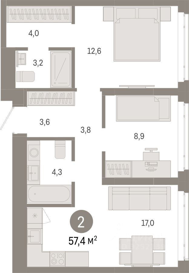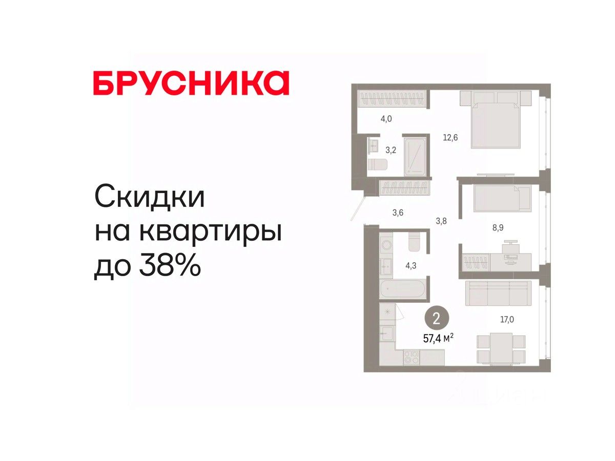 Двухкомнатная квартира с предчистовой отделкой в ЖК "Республики 205" на 8 этаже. Общая площадь: 57.4 кв.м. Высота потолков 2.7 м.