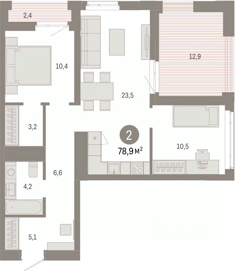 Двухкомнатная квартира с предчистовой отделкой в ЖК "Республики 205" на 16 этаже. Общая площадь: 78.89 кв.м. Высота потолков 2.7 м.