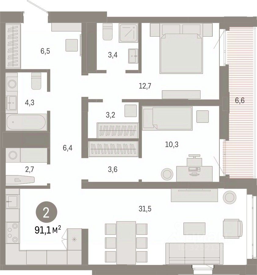 2-комн. квартира от застройщика с предчистовой отделкой в ЖК "Республики 205" на 6 этаже. Общая площадь: 91.08 кв.м. Высота потолков 2.7 м.