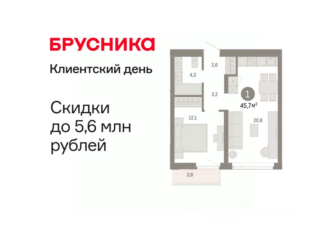 Однокомнатная квартира с предчистовой отделкой в ЖК "Республики 205" на 7 этаже. Общая площадь: 45.77 кв.м. Высота потолков 2.7 м.