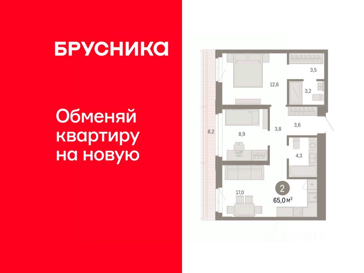 2-комн. квартира с предчистовой отделкой в ЖК "Республики 205" на 11 этаже. Общая площадь: 65.02 кв.м. Высота потолков 2.7 м.