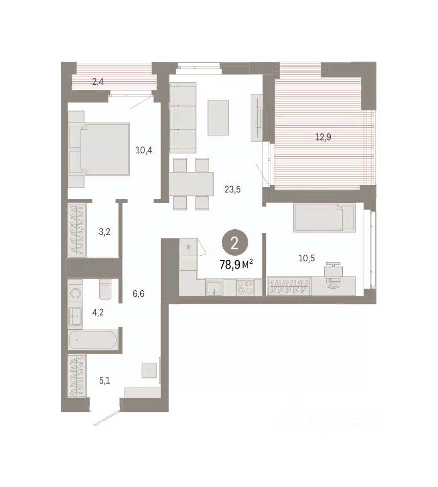 2-комн. квартира с предчистовой отделкой в ЖК "Республики 205" на 15 этаже. Общая площадь: 78.89 кв.м. Высота потолков 2.7 м.