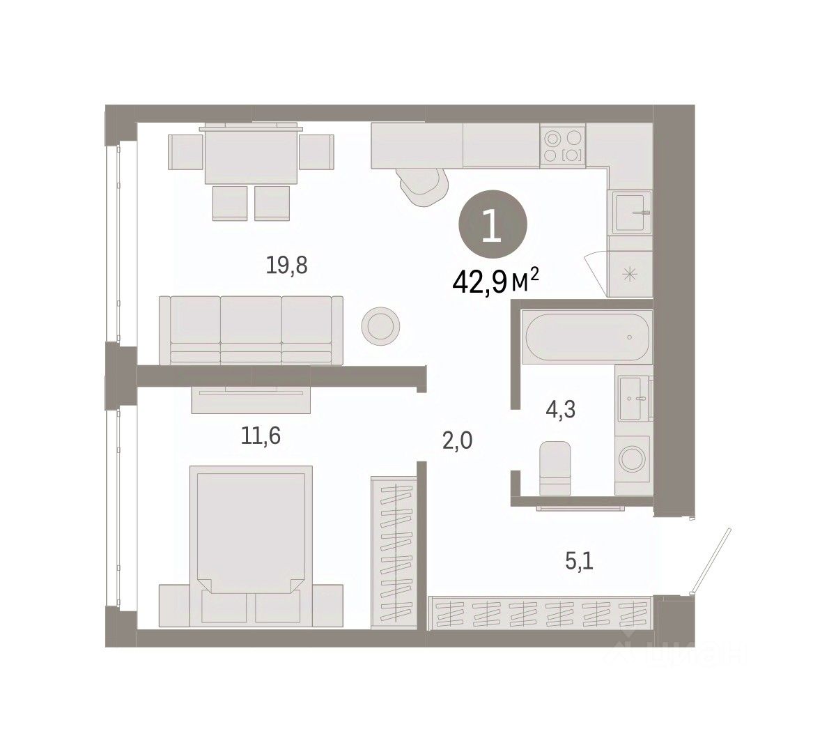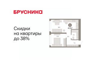 Просторная 1-комн. квартира с предчистовой отделкой в ЖК "Республики 205" на 10 этаже. Общая площадь: 42.87 кв.м. Высота потолков 2.7 м.