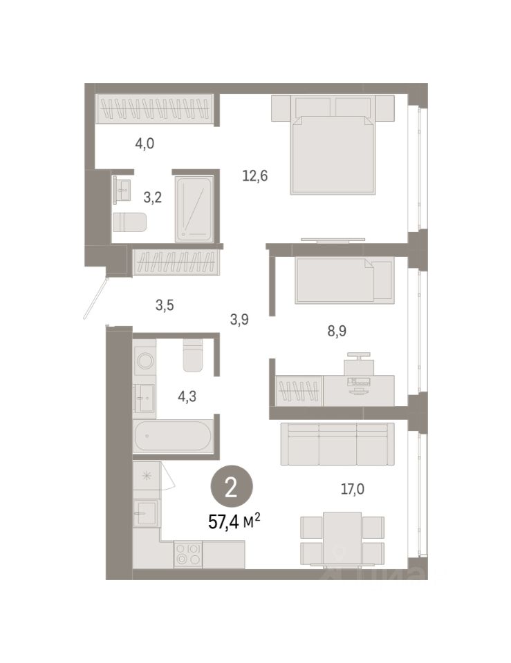 Продается двухкомнатная квартира от застройщика с предчистовой отделкой в ЖК "Республики 205" на 11 этаже. Общая площадь: 57.4 кв.м. Высота потолков 2.7 м.