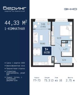 Просторная однокомнатная квартира с предчистовой отделкой в ЖК "Беринг" на 13 этаже. Общая площадь: 44.33 кв.м., жилая: 12.31 кв.м., площадь просторной кухни-столовой: 19.8 кв.м. Все окна выходят на одну сторону. В квартире одна лоджия, один совмещенный санузел. Высота потолков 2.75 м.