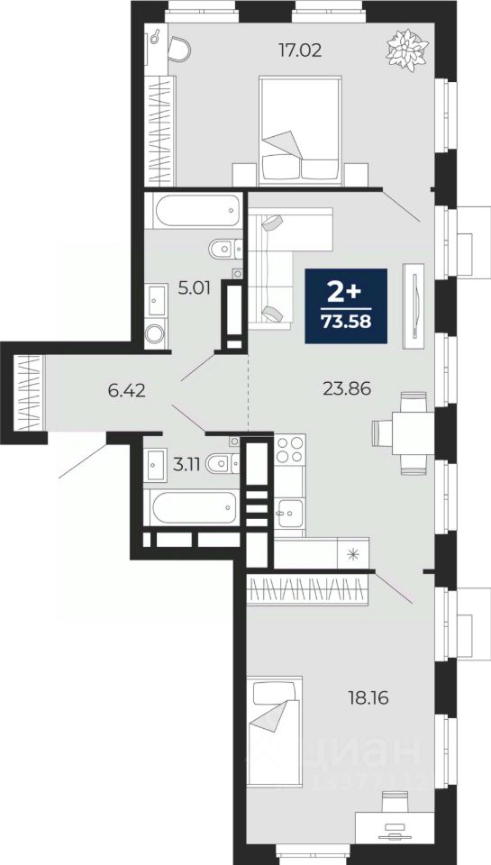 Двухкомнатная квартира от застройщика с предчистовой отделкой в ЖК "Айвазовский City" на 12 этаже. Общая площадь: 73.58 кв.м., жилая: 35.18 кв.м., площадь просторной кухни-столовой: 23.86 кв.м. Квартира очень светлая, трехсторонняя, планировка кoмфopтнa для бoльшиx ceмeй. В квартире два совмещенных санузла. Высота потолков 2.7 м.