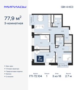 Просторная трехкомнатная квартира с предчистовой отделкой в ЖК "Мириады" на 3 этаже. Общая площадь: 77.9 кв.м., жилая: 32.8 кв.м., площадь просторной кухни-столовой: 18.3 кв.м. Квартира угловая, идеально подойдет любителям тишины и панорамных видов. В квартире два балкона, два совмещенных санузла. Высота потолков 2.7 м.