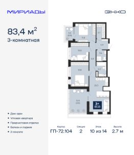 Трехкомнатная квартира от застройщика с предчистовой отделкой в ЖК "Мириады" на 10 этаже. Общая площадь: 83.4 кв.м., жилая: 35.6 кв.м., площадь просторной кухни-столовой: 20.5 кв.м. Угловая квартира, идеально подойдет любителям тишины и панорамных видов. В квартире один балкон и одна лоджия, два совмещенных санузла. Наличие террасы в квартире дает возможность для обустройства дополнительной площади. Высота потолков 2.7 м.