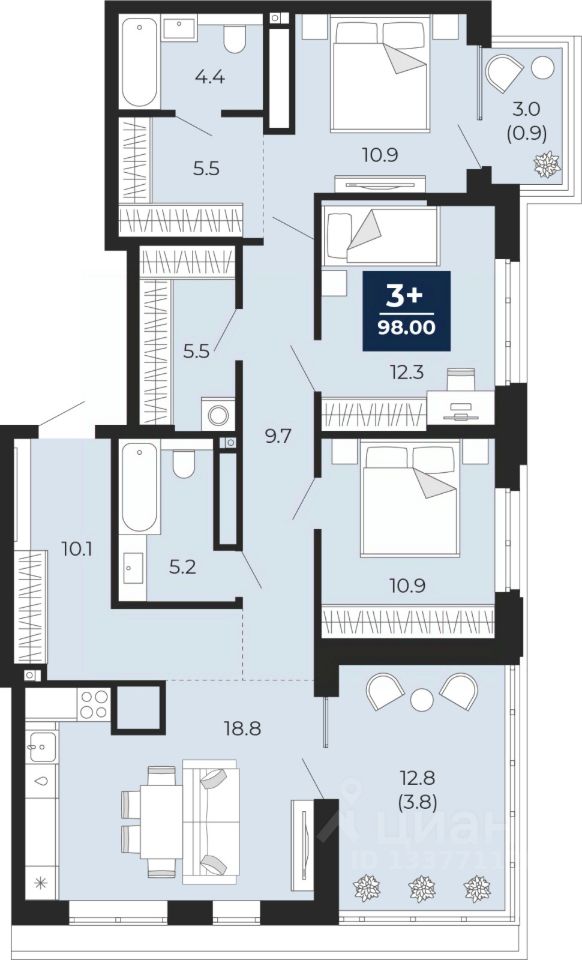 3-комн. квартира с предчистовой отделкой в ЖК "Мириады" на 10 этаже. Общая площадь: 98 кв.м., жилая: 34.1 кв.м., площадь просторной кухни-столовой: 18.8 кв.м. Квартира угловая, идеально подойдет любителям тишины и панорамных видов. В квартире один балкон и одна лоджия, два совмещенных санузла. Терраса представляет собой роскошную зону отдыха, где вы на свой вкус можете создать атмосферу комфорта и уюта. Высота потолков 2.7 м.