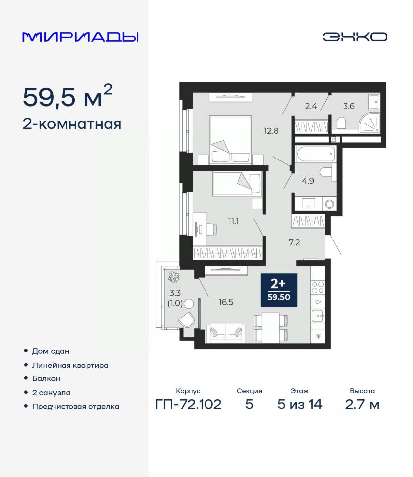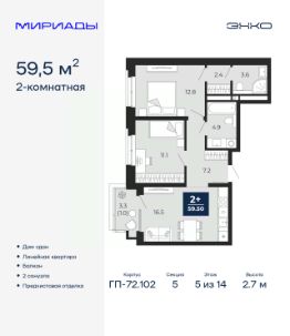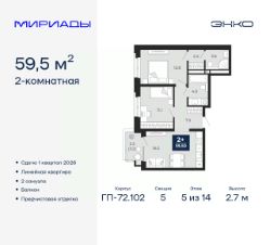 2-комн. квартира с предчистовой отделкой в ЖК "Мириады" на 5 этаже. Общая площадь: 59.5 кв.м., жилая: 23.9 кв.м., площадь просторной кухни-столовой: 16.5 кв.м. Комнаты изолированные, все окна выходят на одну сторону. В квартире один балкон, два совмещенных санузла. Высота потолков 2.7 м.