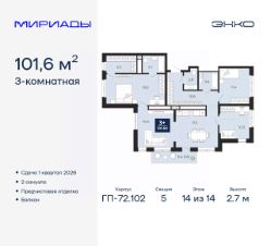 3-комн. квартира с предчистовой отделкой в ЖК "Мириады" на 14 этаже. Общая площадь: 101.6 кв.м., жилая: 40.7 кв.м., площадь просторной кухни-столовой: 32.4 кв.м. Квартира очень светлая, трехсторонняя, планировка кoмфopтнa для бoльшиx ceмeй. В квартире один балкон, один совмещенный и один раздельный санузел. Высота потолков 2.7 м.