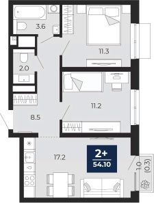 Просторная 2-комн. квартира с предчистовой отделкой в ЖК "Мириады" на 20 этаже. Общая площадь: 54.1 кв.м., жилая: 22.5 кв.м., площадь просторной кухни-столовой: 17.2 кв.м. Комнаты изолированные, все окна выходят на одну сторону. В квартире одна лоджия, один совмещенный и один раздельный санузел. Высота потолков 2.7 м.