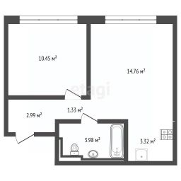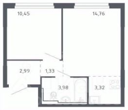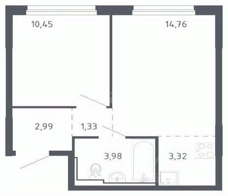 Квартира расположена на 14-м этаже 18-этажного монолитно-кирпичного дома (корпус 1.3), общая площадь — 36,83 м². Планировка включает кухню-нишу (3,32 м²), две жилые комнаты (14,76 м² и 10,45 м²), прихожую (2,99 м²), коридор (1,33 м²) и совмещенный санузел (3,98 м²). Без балкона, но с акцентом на функциональность пространства.