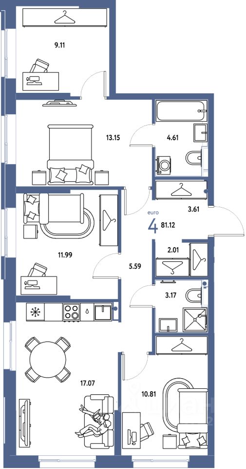 Продаётся 4-комнатная квартира в строящемся доме (ГП-9 (дом Хельсинки, Защитников Отечества, 15)), срок сдачи: IV-кв. 2027, общей площадью 81.12 кв.м., на 16 этаже. В жилом комплексе "Европейский берег" предусмотрено строительство отдельно стоящих, закрытых, надземных паркингов. Попасть к своему автомобилю Вы сможете прямо из подъезда, через теплый переход, не выходя при этом на улицу. Парковочное место уже включено в стоимость большинства квартир. В квартирах комплекса "Европейский берег" гостиная объединена с кухней, что позволяет создать комфортное пространство для семейного времяпрепровождения. Проектом предусмотрено большое количество 4 и 5 комнатных квартир, для того, чтобы у каждого была своя комната.