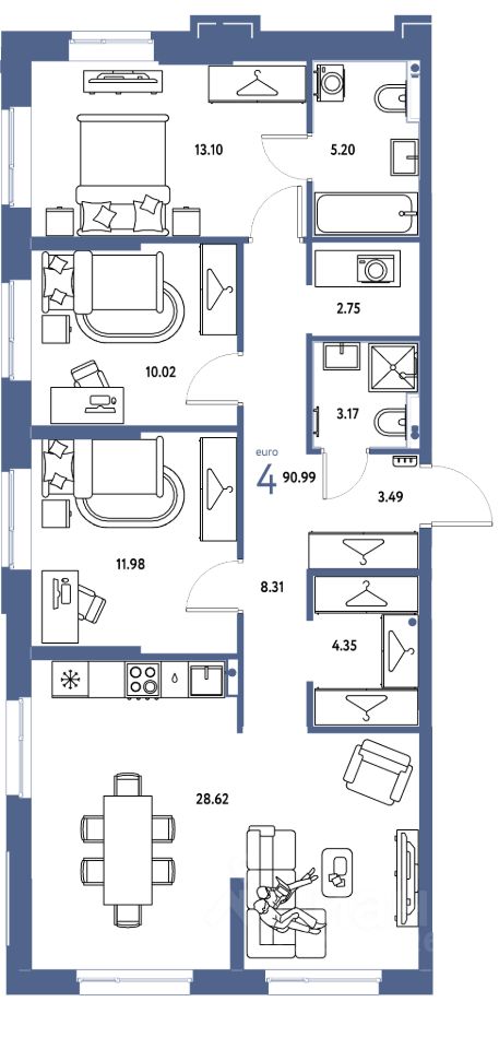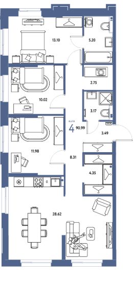 Продаётся 4-комнатная квартира в строящемся доме (ГП-9 (дом Хельсинки, Защитников Отечества, 15)), срок сдачи: IV-кв. 2027, общей площадью 90.99 кв.м., на 24 этаже. В жилом комплексе "Европейский берег" предусмотрено строительство отдельно стоящих, закрытых, надземных паркингов. Попасть к своему автомобилю Вы сможете прямо из подъезда, через теплый переход, не выходя при этом на улицу. Парковочное место уже включено в стоимость большинства квартир. В квартирах комплекса "Европейский берег" гостиная объединена с кухней, что позволяет создать комфортное пространство для семейного времяпрепровождения. Проектом предусмотрено большое количество 4 и 5 комнатных квартир, для того, чтобы у каждого была своя комната.