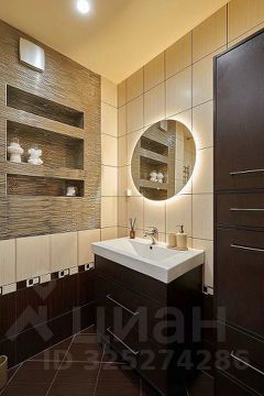 Ванная комната приглашает расслабиться и заняться собой. Шторы, дизайнерский столик и зеркало с теплой подсветкой создают уютную атмосферу для уединения.