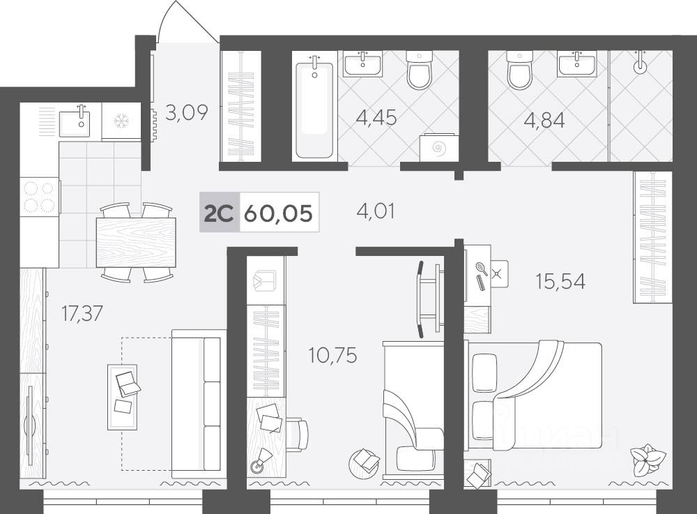 Продаётся 2-комнатная квартира в строящемся доме (ГП 2 (Сергея Корепанова, 34)), срок сдачи: IV-кв. 2027, общей площадью 60.05 кв.м., на 9 этаже. Новый жилой комплекс "Скандиа. Квартал у Леса" от Специализированного застройщика "СКАНДИА У ЛЕСА" расположен в г. Тюмень на ул. Бориса Прудаева.