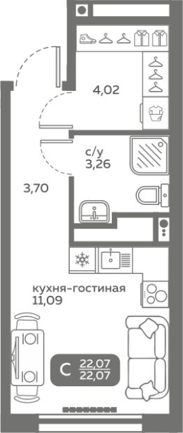 Прямая продажа от застройщика! Продается студия в строящемся ЖК "Меридиан Слобода", срок сдачи: I-кв. 2027, общей площадью 22.07 м², на 8 этаже из 20. Площадь кухни — 11.09 м².
