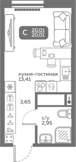 Прямая продажа от застройщика! Продается студия в строящемся ЖК "Меридиан Слобода", срок сдачи: I-кв. 2027, общей площадью 20.01 м², на 12 этаже из 20. Площадь кухни — 13.41 м².