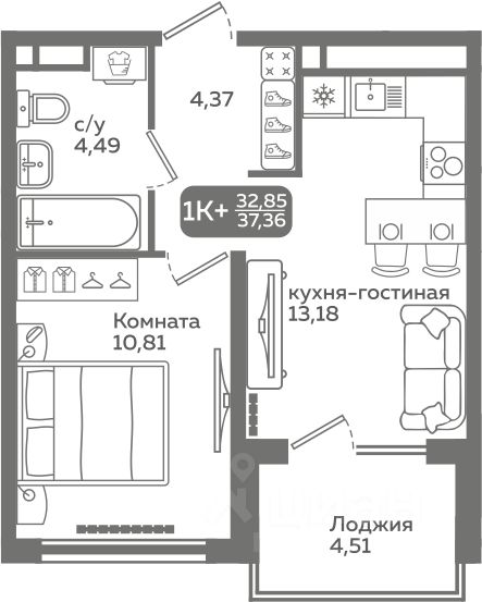 Прямая продажа от застройщика! Продается однокомнатная квартира в строящемся ЖК "Меридиан Слобода", срок сдачи: I-кв. 2027, общей площадью 32.85 м², на 4 этаже из 21. Площадь кухни — 13.18 м².