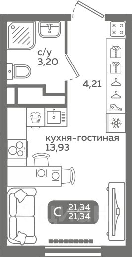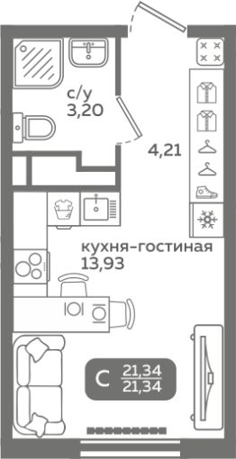 Прямая продажа от застройщика! Продается студия в строящемся ЖК "Меридиан Слобода", срок сдачи: I-кв. 2027, общей площадью 21.34 м², на 9 этаже из 21. Площадь кухни — 13.93 м².