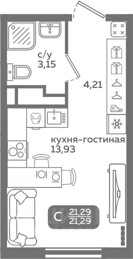 Прямая продажа от застройщика! Продается студия в строящемся ЖК "Меридиан Слобода", срок сдачи: I-кв. 2027, общей площадью 21.29 м², на 12 этаже из 21. Площадь кухни — 13.93 м².