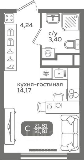 Прямая продажа от застройщика! Продается студия в строящемся ЖК "Меридиан Слобода", срок сдачи: I-кв. 2027, общей площадью 21.81 м², на 12 этаже из 21. Площадь кухни — 14.17 м².